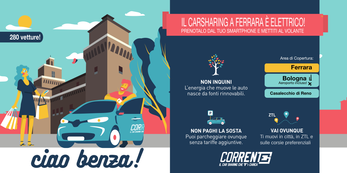 280 auto completamente elettriche nell’intero bacino servito da Corrente. Con l’approdo a Ferrara la flotta si arricchisce di ulteriori 25 macchine. Si tratta di Renault Zoe a 5 posti, dotate di cambio automatico.
